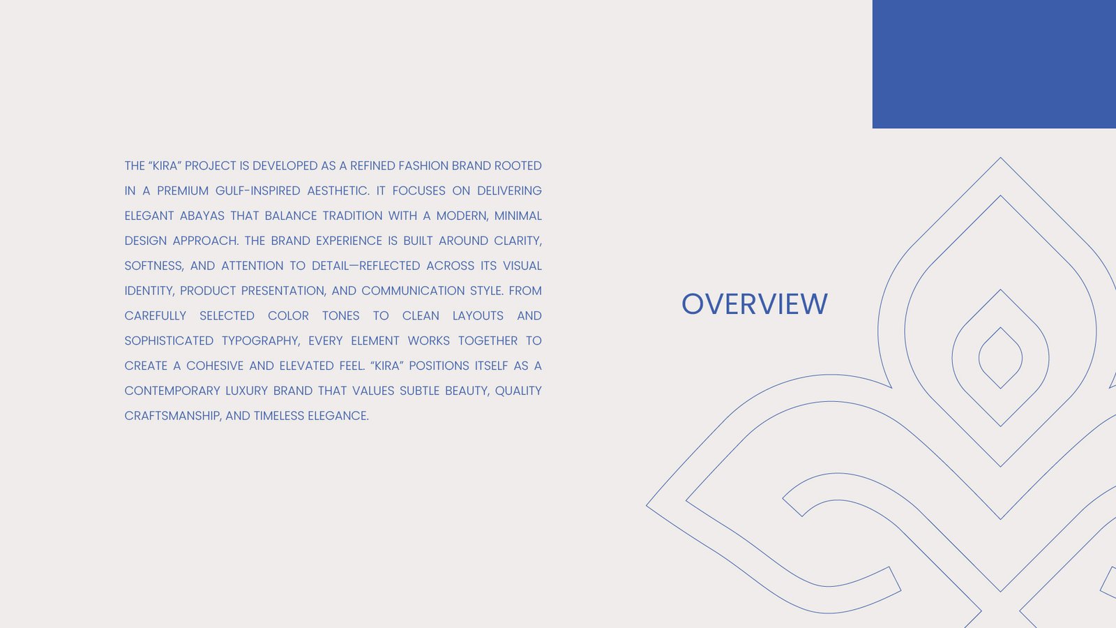 يركّز المشروع على تقديم عبايات أنيقة توازن بين التقاليد ونهج تصميم حديث وبسيط. تعتمد تجربة العلامة على الوضوح، والنعومة والاهتمام بالتفاصيل وهو ما ينعكس في هويتها البصرية وعرض المنتجات، وأسلوب التواصل من خلال اختيار دقيق للألوان، وتخطيطات نظيفة وTypography راقية حيث تعمل جميع العناصر معاً لخلق إحساس متكامل ومرتفع. تتموضع KIRA كعلامة فاخرة معاصرة تقدّر الجمال الهادئ، وجودة الحِرفية، والأناقة الخالدة.