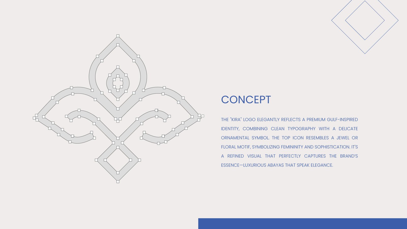 شعار KIRA يعكس بأناقة هوية مستوحاة من الطابع الخليجي الفاخر، حيث يجمع بين خطوط Typography نظيفة ورمز زخرفي دقيق. الأيقونة العلوية تشبه جوهرة أو زخرفة نباتية، مما يرمز إلى الأنوثة والرقي. وهو تكوين بصري راقٍ يعبّر بشكل مثالي عن جوهر العلامة عبايات فاخرة تنطق بالأناقة.
